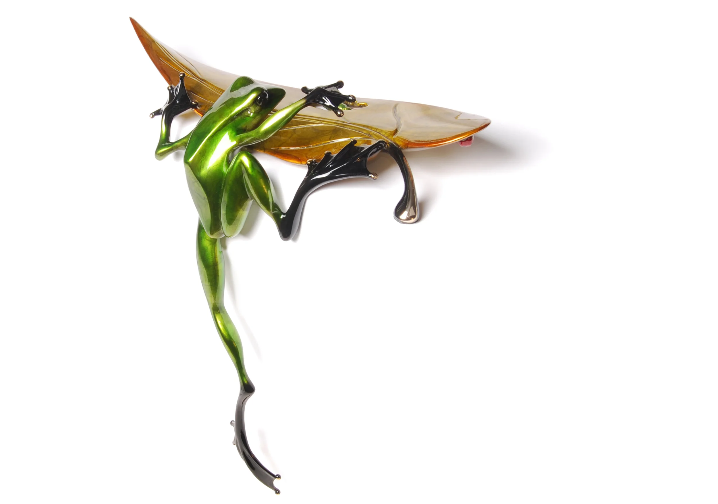 The frogs are made using the labour-intensive lost wax bronze casting process. Once cast, each frog is meticulously cleaned and polished before being patinated to achieve dramatic and brilliant colours. So unusually lustrous and vibrant is the finish on the frogs that people often think that they are made of glass – one hold of a frog, however, reveals the surprisingly heavy and pleasing weight of solid bronze. Tim’s patinas are the envy of metal artists worldwide, and he wisely keeps that part of the making process a secret.